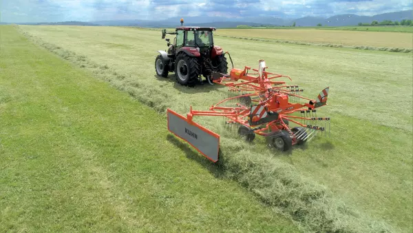 A largura de enleiramento é hidraulicamente ajustável de 3,00 a 5,80 m. Densidades de forragem variáveis, desvio de obstáculo e acabamento de área não são mais um problema. Para forragem muita densa e para produzir leiras à noite, o GA 6002 também pode fornecer duas leiras em cada passagem.